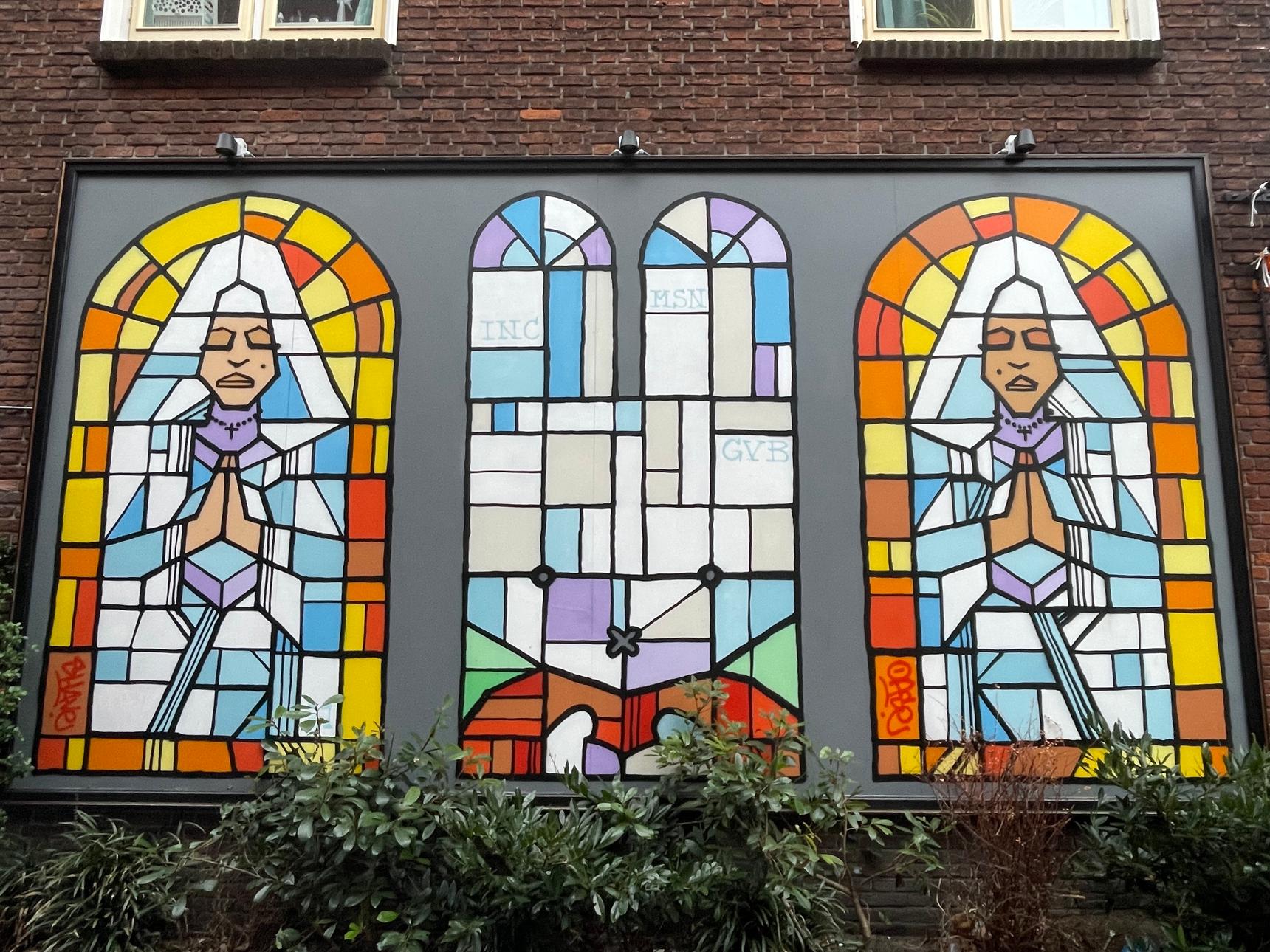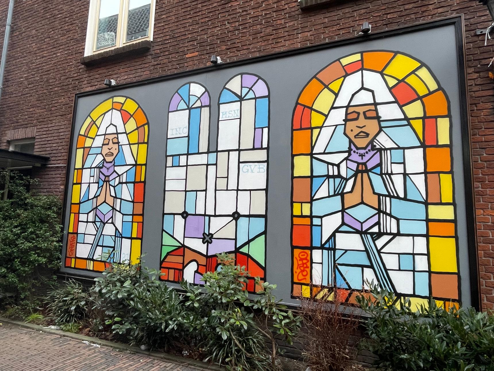 This artwork is located in the Kloostersteeg, which, until 1829, provided access to the buildings of the Wittevrouwenklooster (a convent). The painting mimics three stained-glass windows. On two of them, nuns are depicted. In the middle, there is Miffy: one of the icons of Utrecht.