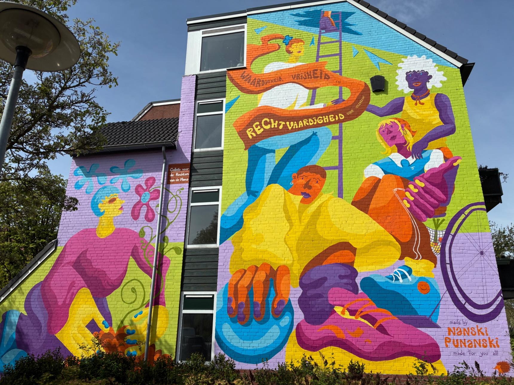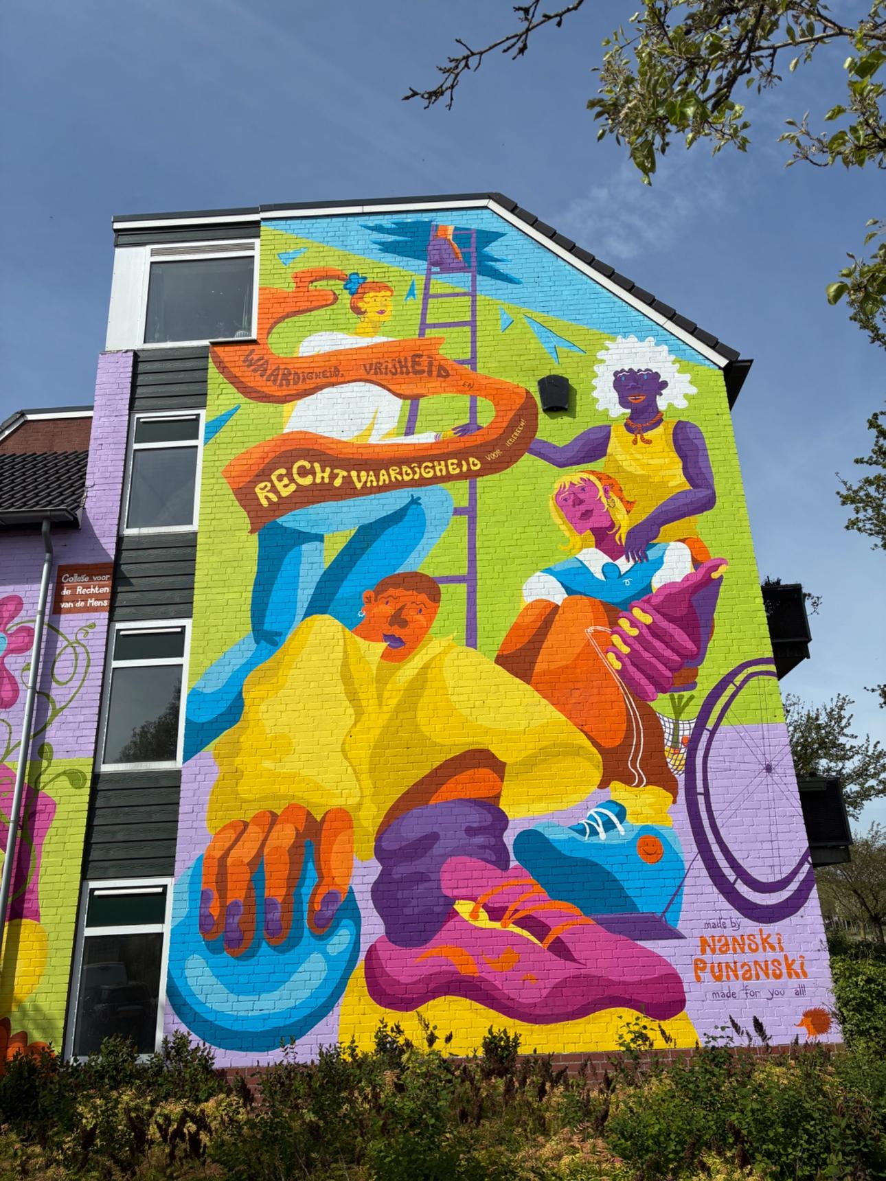 Commissioned by the Netherlands Institute for Human Rights, Nanna de Jong, also known as Nanski Punanski, has created a mural on Kariboestraat. Through this work, the Utrecht-based artist aims to shine a spotlight on people who are not usually in the spotlight.