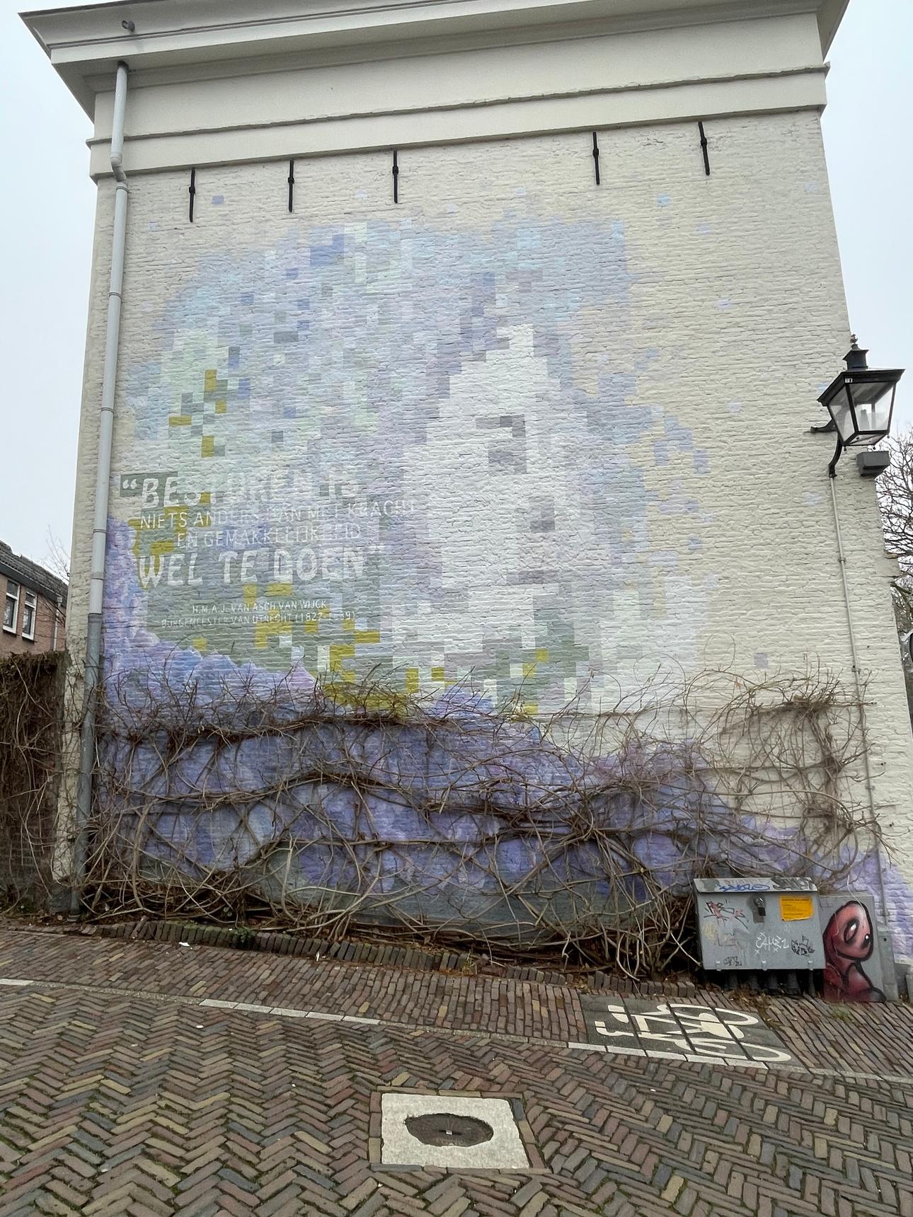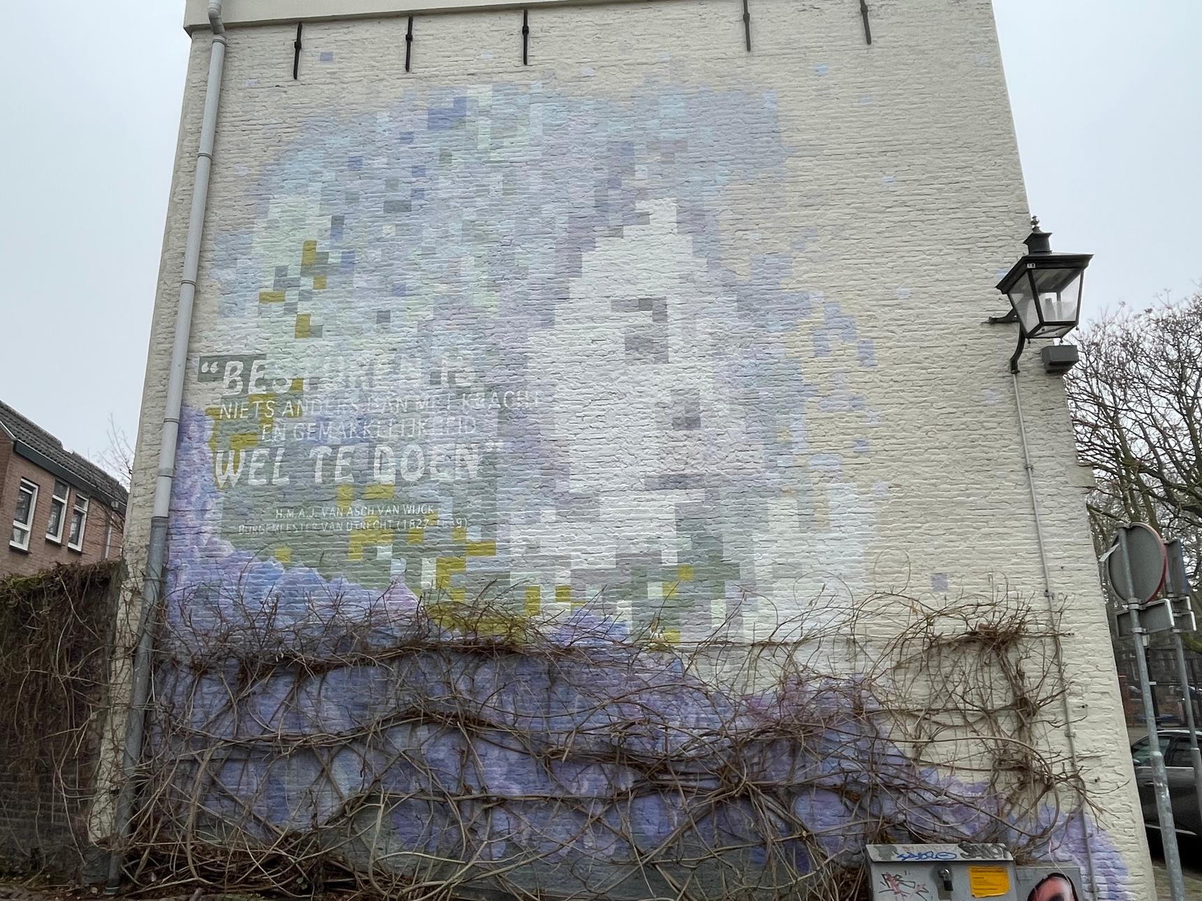 The artist of this mural was asked by the residents to create this painting. They had two criteria: the artwork had to fit in with the wisteria that grows here, and the painting had to have a connection to the name of the street. The mural depicts Hubert Matthijs Adriaan Jan van Asch van Wijck, who was the mayor of Utrecht between 1827 and 1839. The street is named after him. The quote on the painting reads: “Besturen is niets anders dan met kracht en gemakkelijkheid wel te doen” or: “Governing is nothing more than doing it with strength and ease."