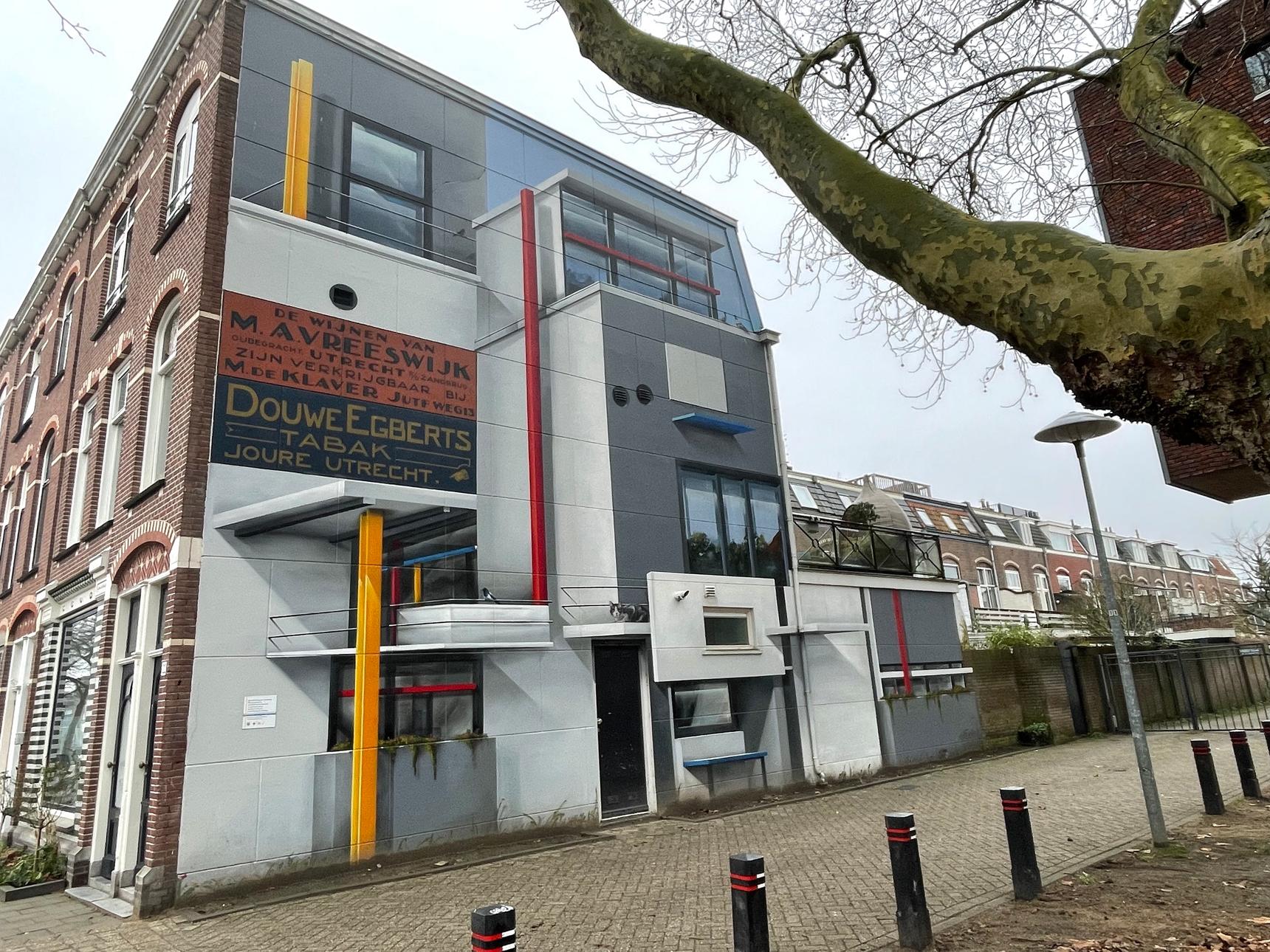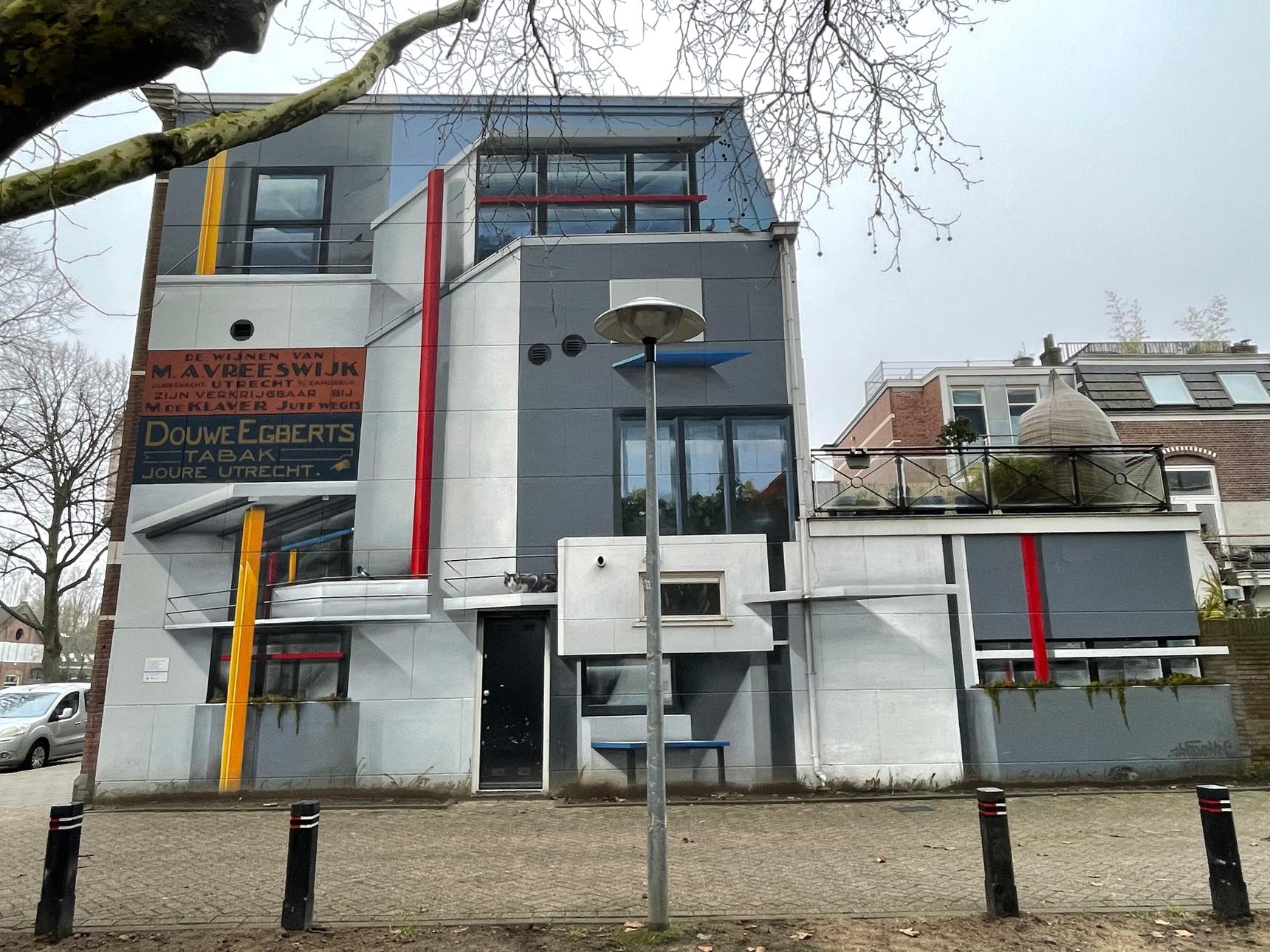 A mural inspired by the Rietveld Schröder House in Utrecht, designed by Gerrit Rietveld. The building was constructed entirely according to the ideas of the De Stijl art movement. The animals hiding in the painting are all local residents. The old Douwe Egberts advertisement that had been on the wall for decades had to remain intact.