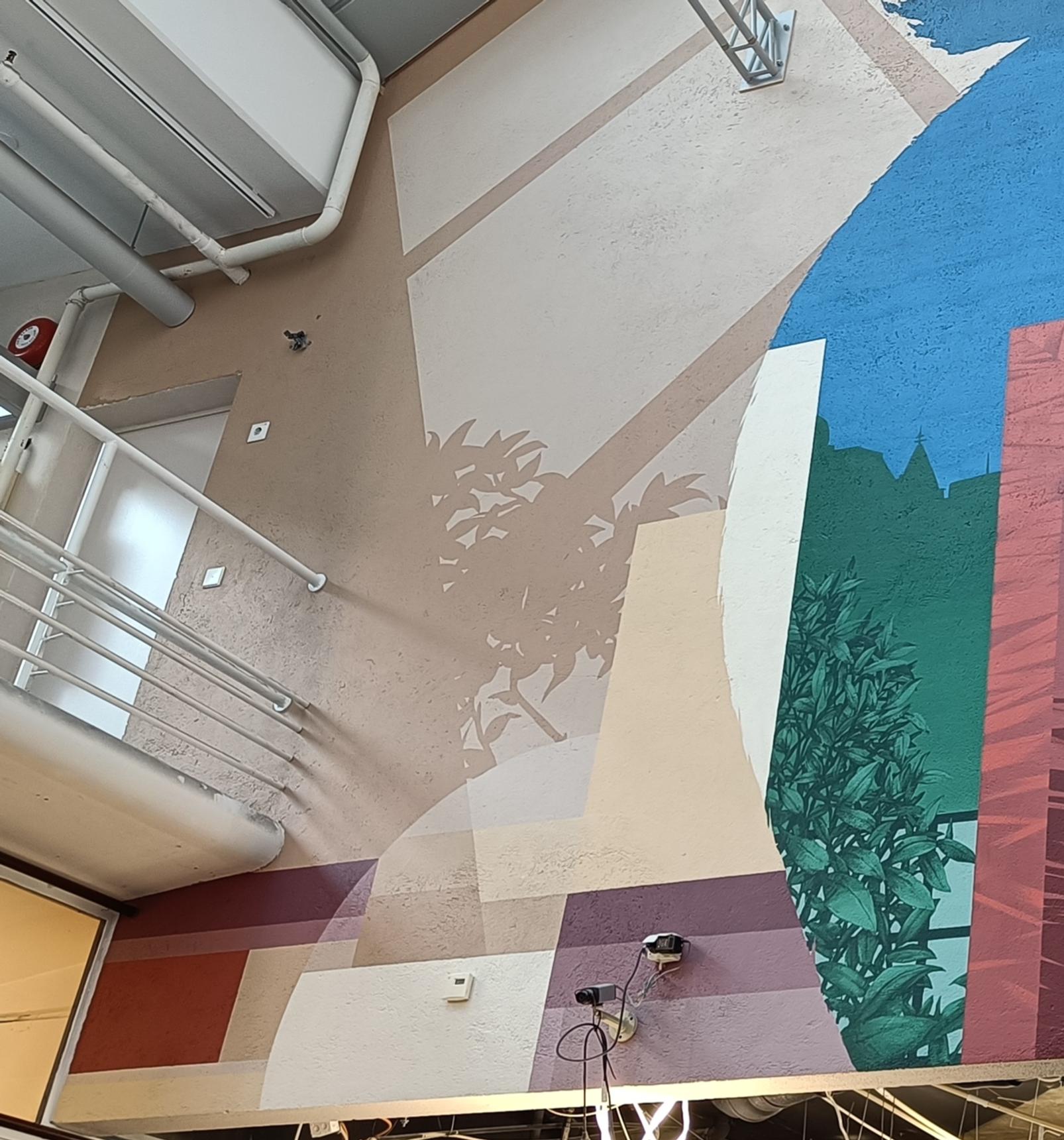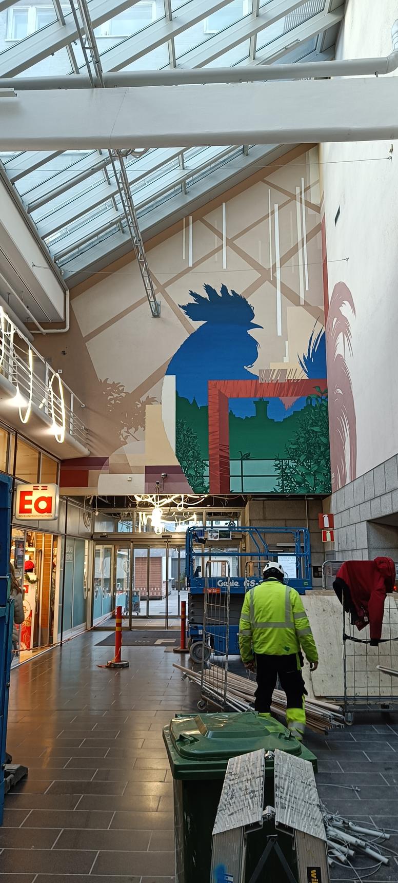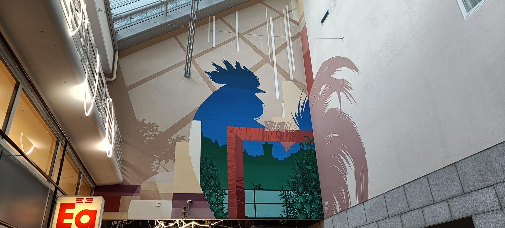 Indoor mural acts as gate between the outdoor mural (2025) at Kukontori ('Roosters square'), and indoor artwork by Zoltan Popovits (1985), which draws inspiration from oasis and Japanese garden.