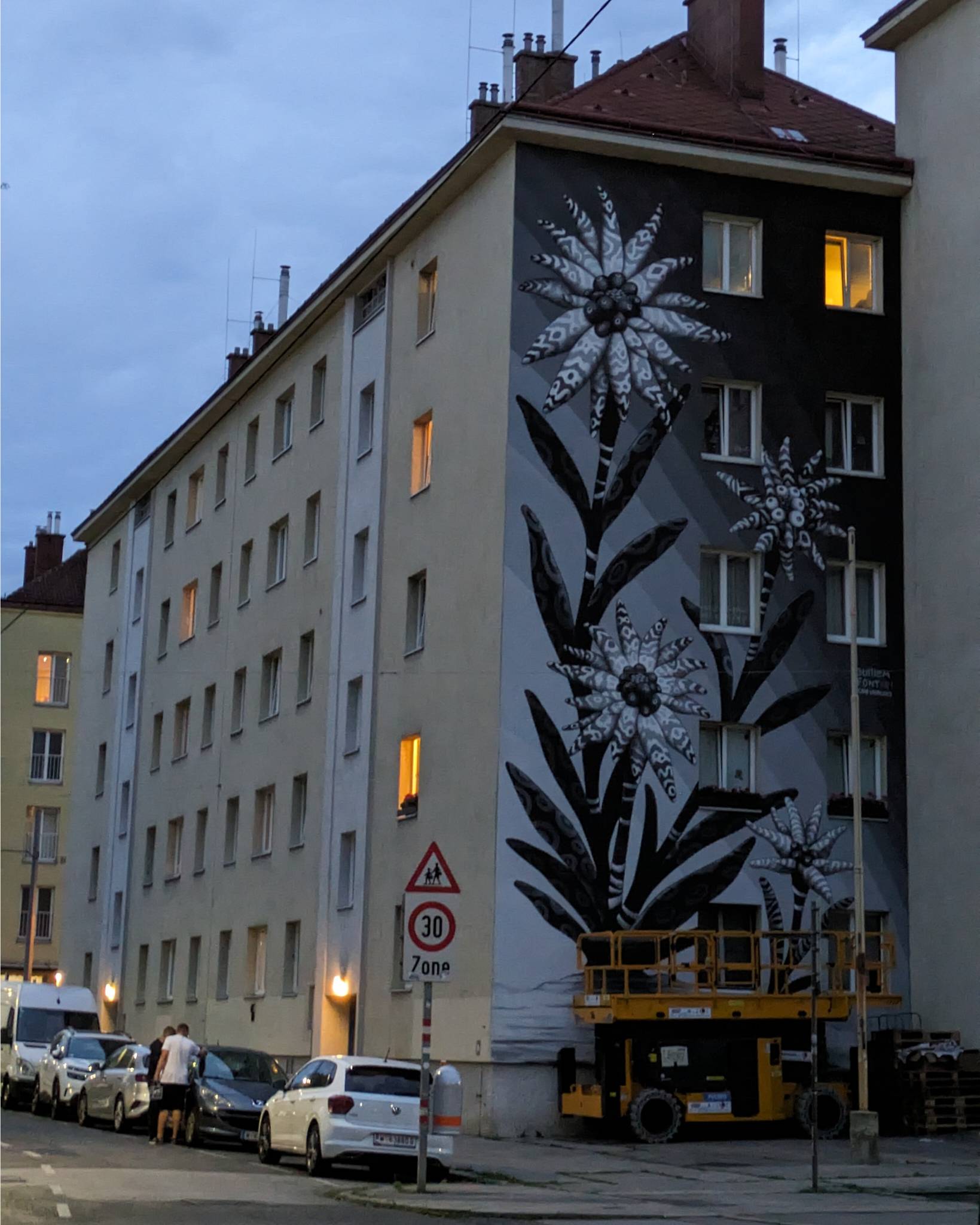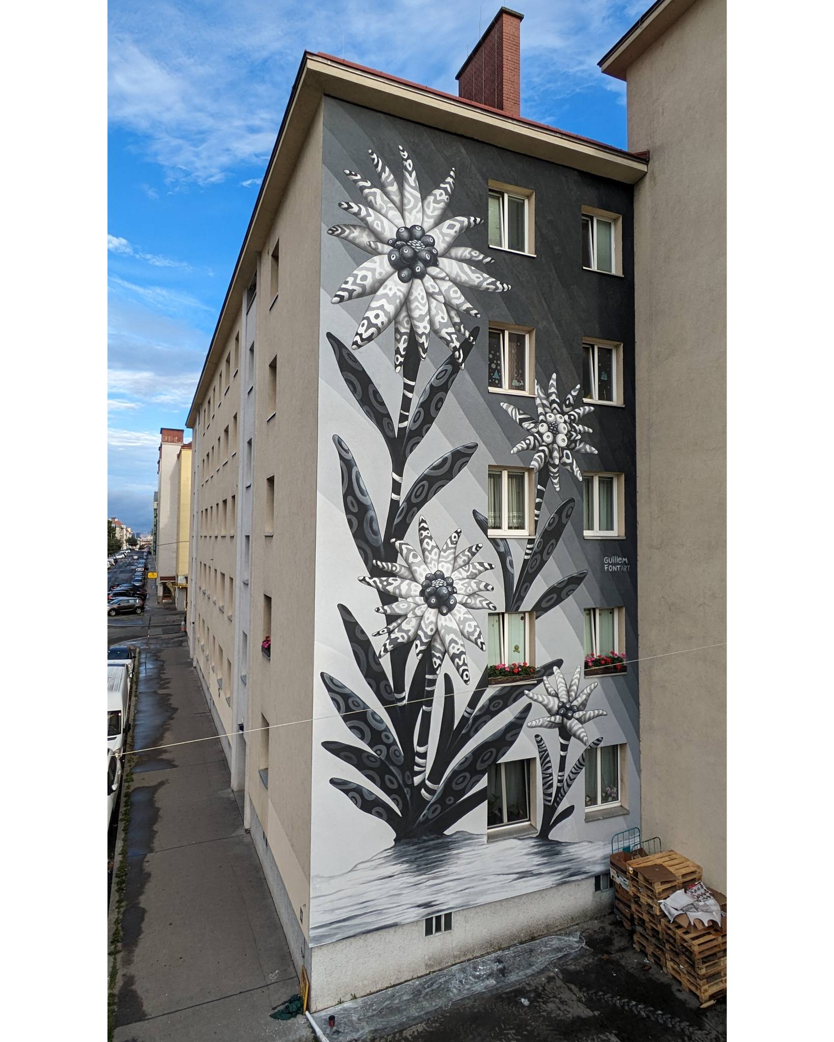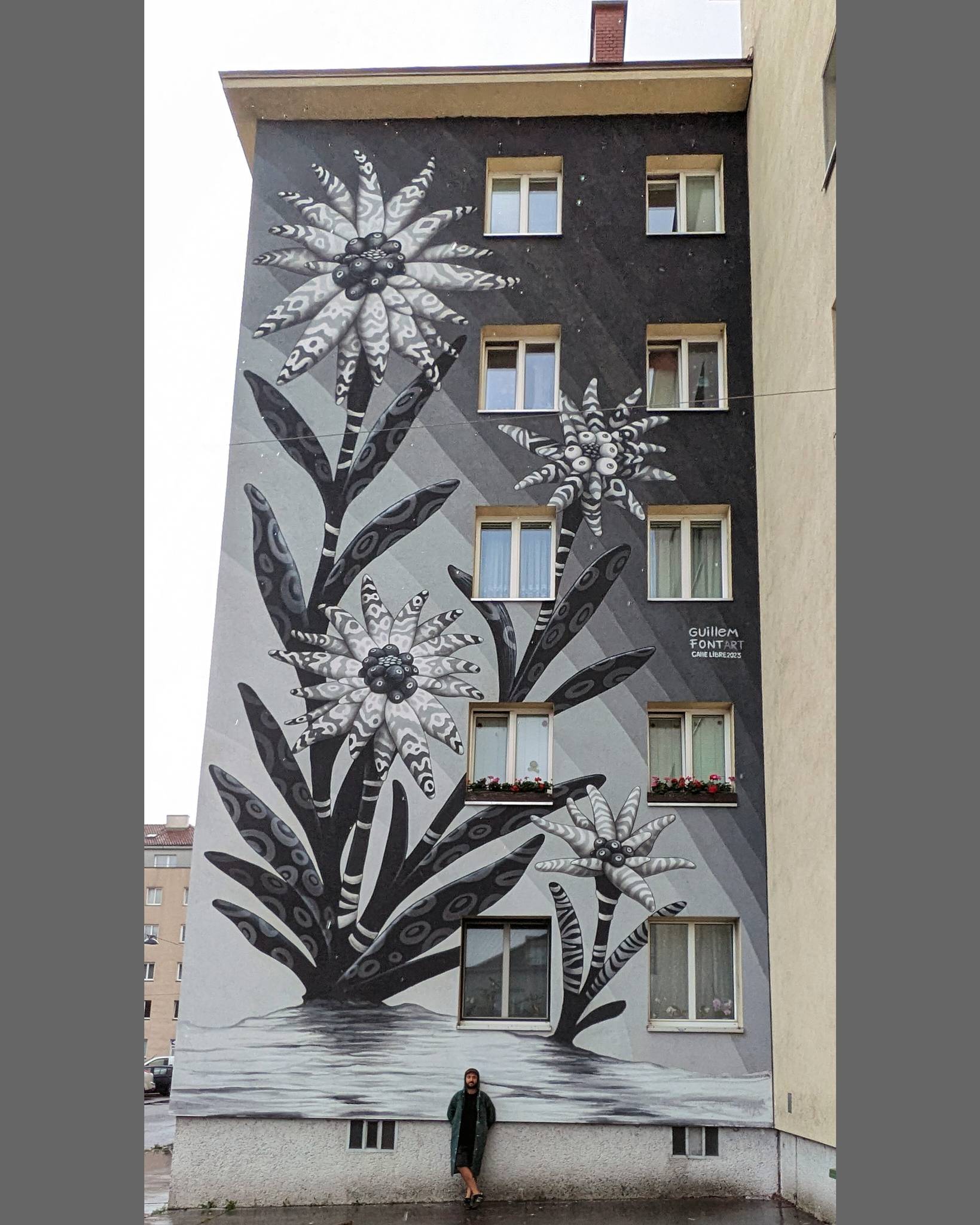 The Ottakring neighborhood, in the city of Vienna, is a neighborhood known for its cultural diversity, where people, aromas and colors from different parts of the world coexist. The "Edelweiss" flowers that I made in this neighborhood contain shades of gray ranging from black to white, blooming as a symbol of transformation, anti-racism, mixture and coexistence.