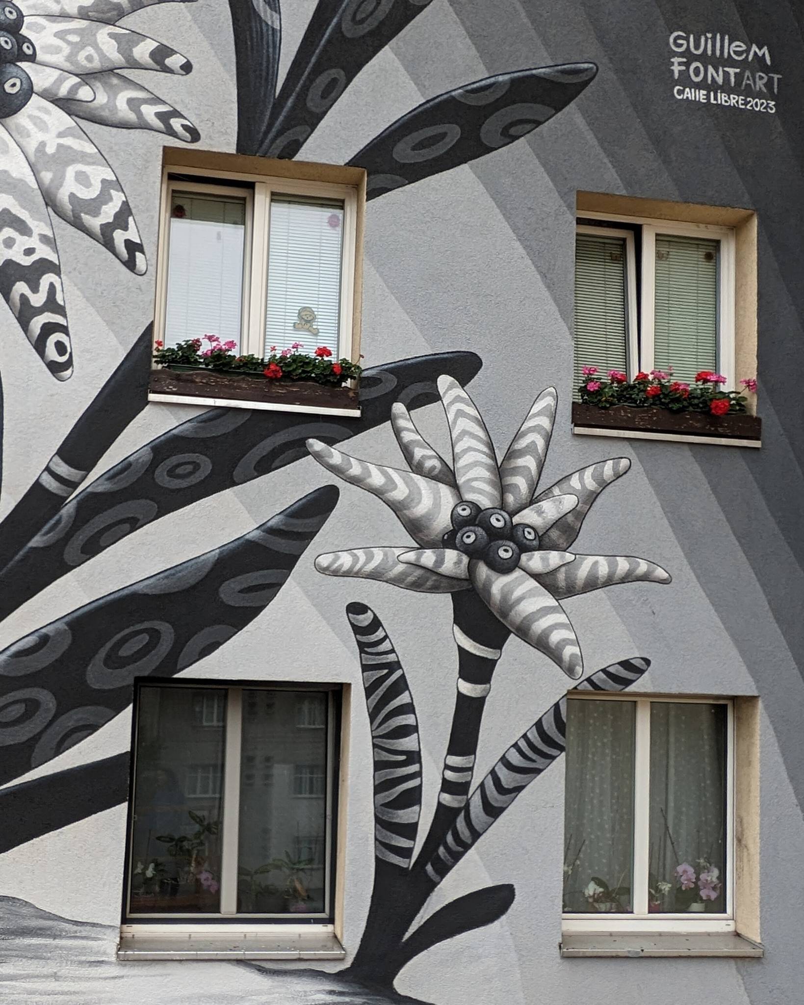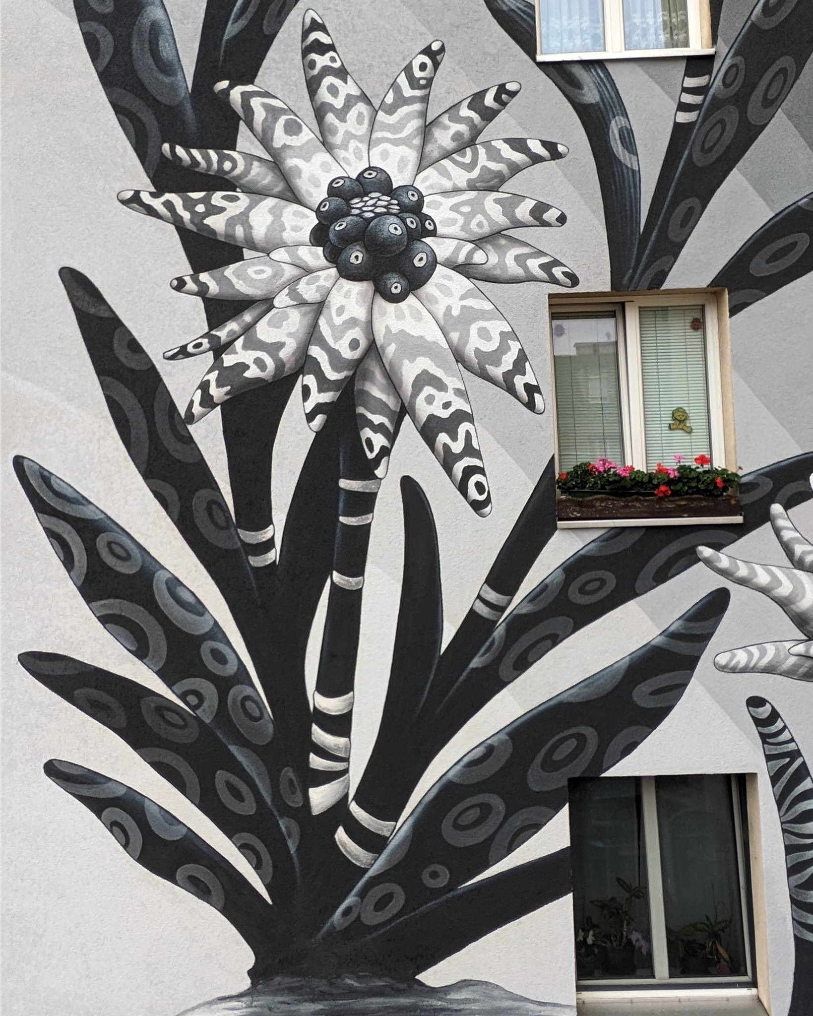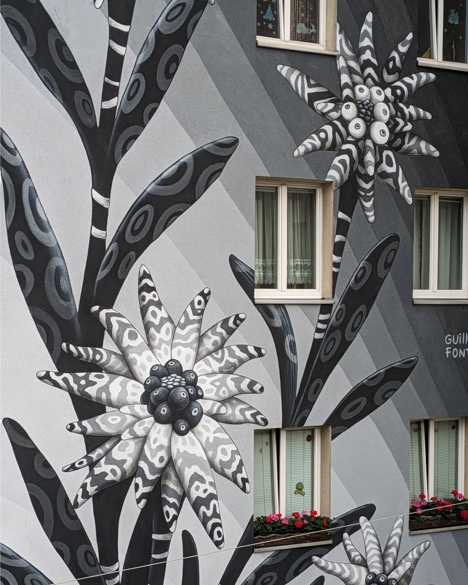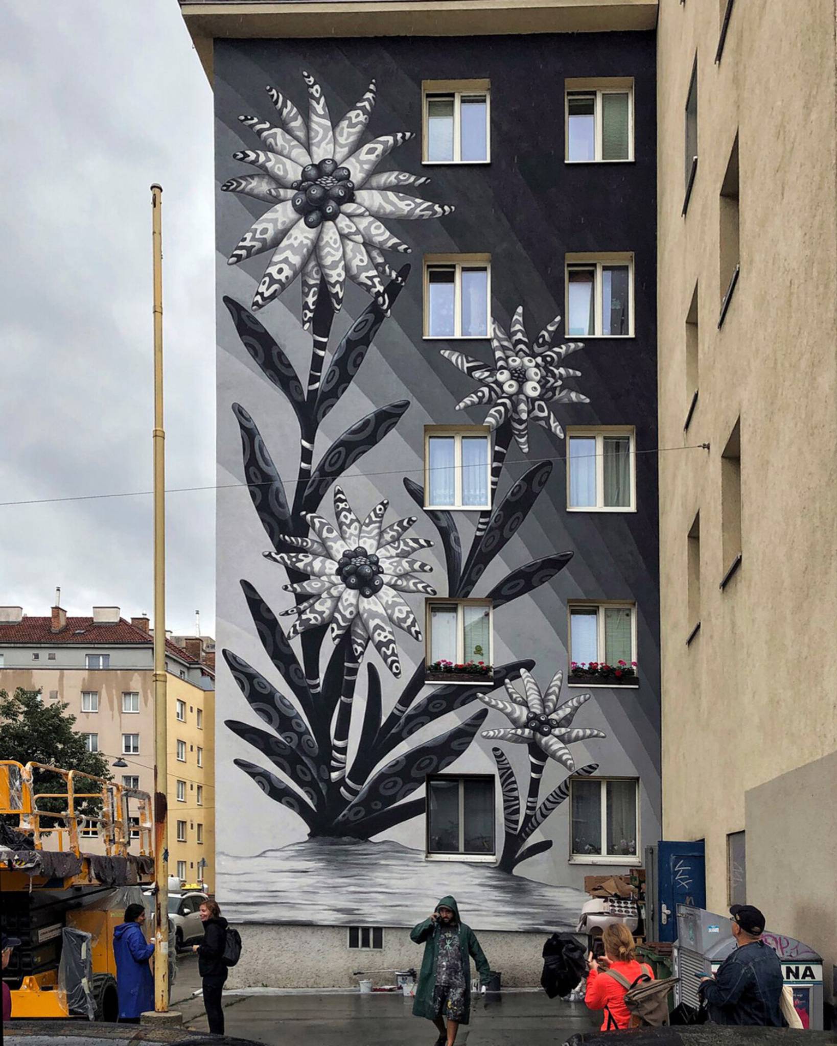 The Ottakring neighborhood, in the city of Vienna, is a neighborhood known for its cultural diversity, where people, aromas and colors from different parts of the world coexist. The "Edelweiss" flowers that I made in this neighborhood contain shades of gray ranging from black to white, blooming as a symbol of transformation, anti-racism, mixture and coexistence.