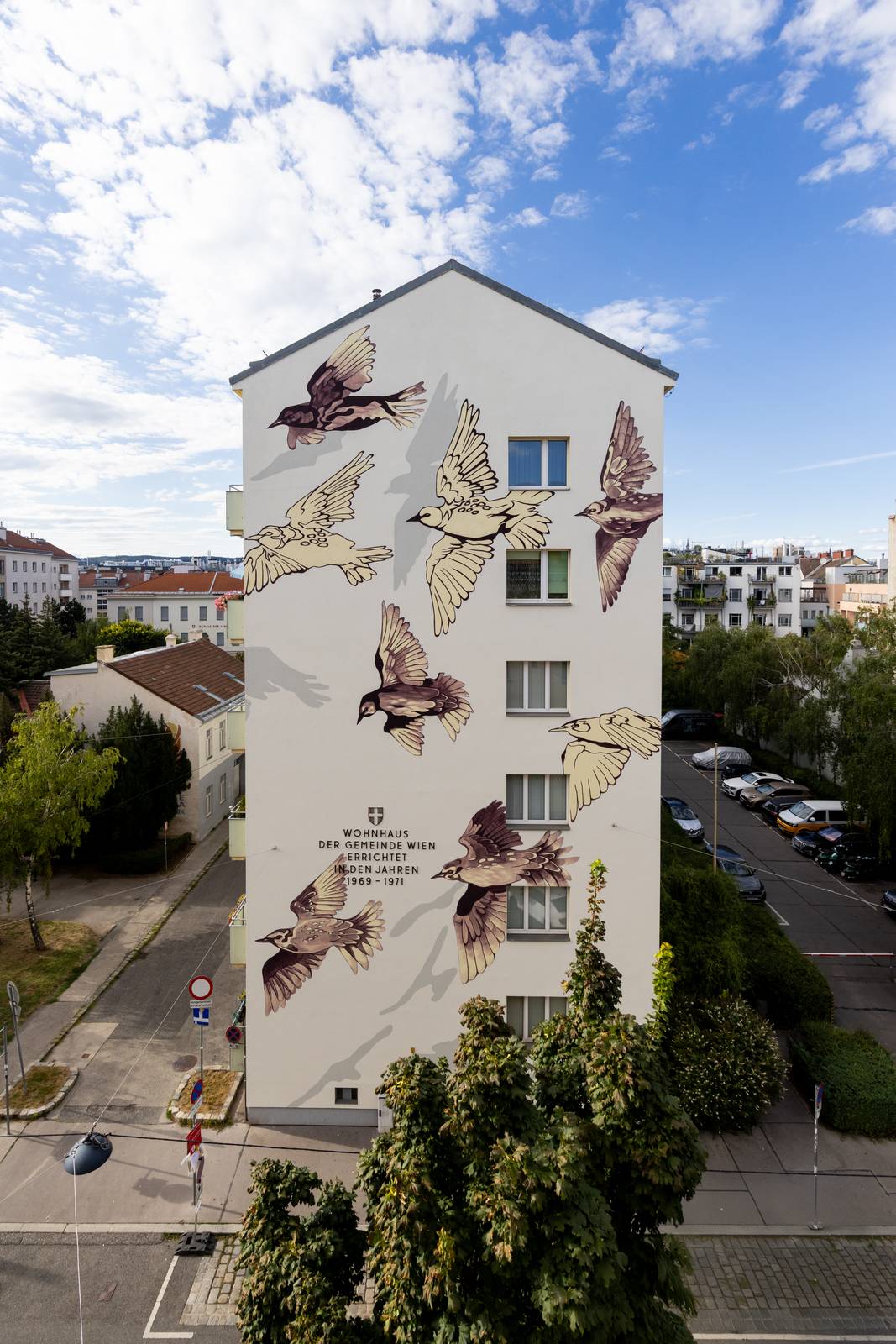 The local artist recently moved to this corner of vienna and since birds are kind of her thing she chose to paint starlings.
