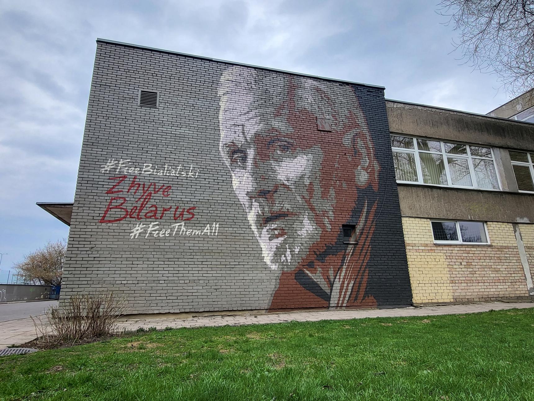 Belarusian human rights defender and Nobel Peace Prize laureate Ales Bialiatski active work is honored by a mural on the wall of S. Daukantas Gymnasium, across from the Belarusian Embassy. This work was created as an expression of support and solidarity not only with Ales Bialiatski, but also with all other political prisoners and activists imprisoned for their struggle for freedom, democracy, and resistance to the regime of Alexander Lukashenko.