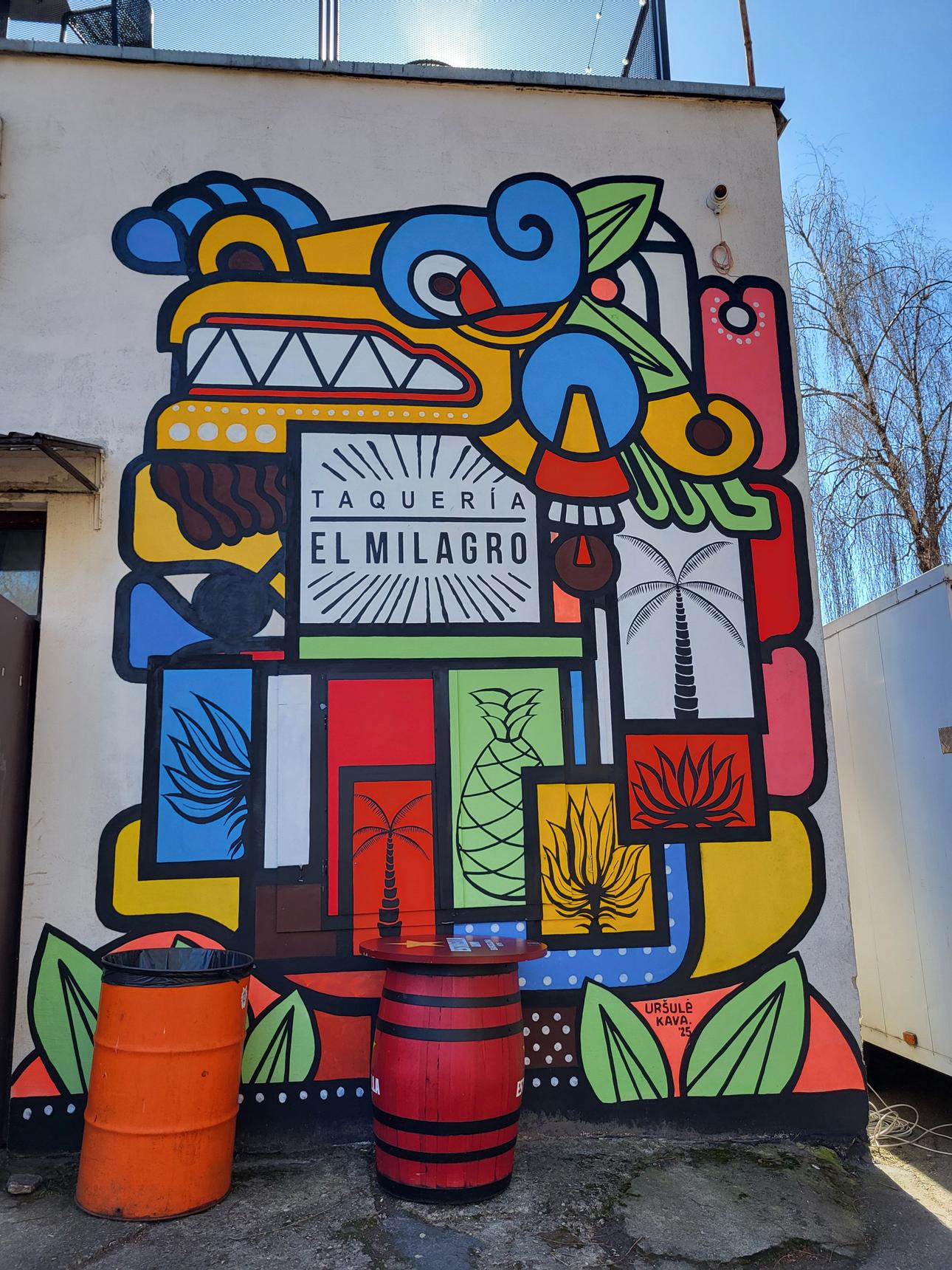 New mural for a Mexican restaurant "El Milagro". This mural changed the previous artwork by ETTOJA. You can notice that both murals uses same colors and some same shapes.