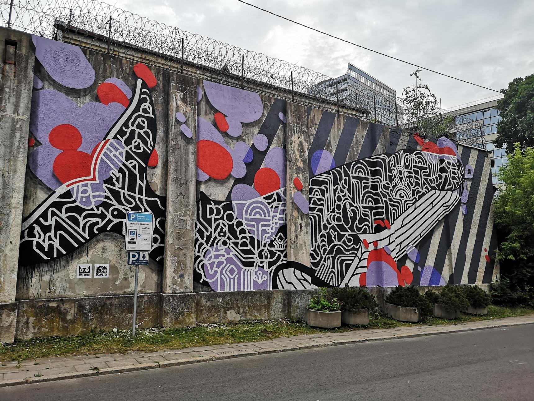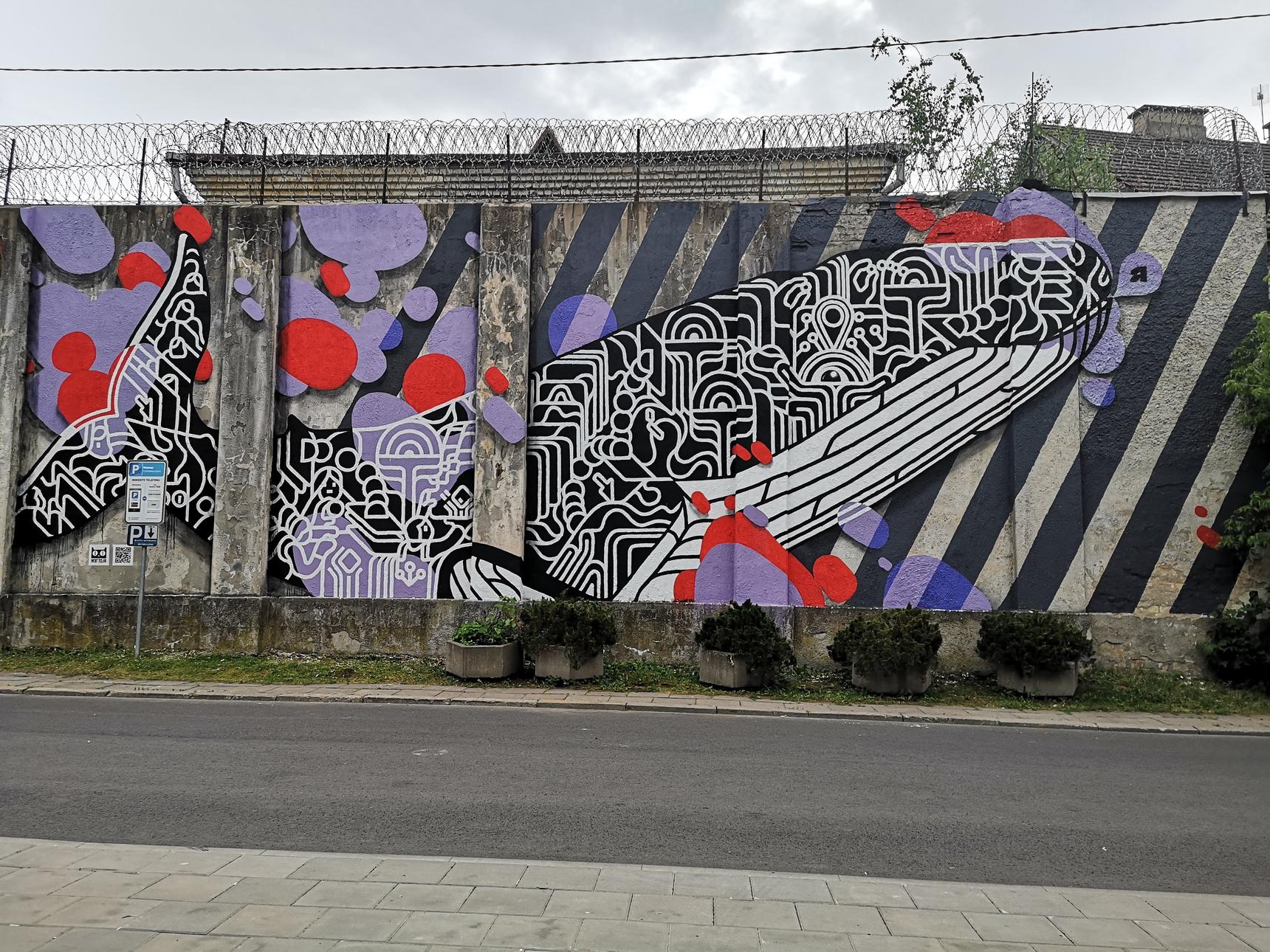 After exactly one year at the interior of "Rockit" techhub the Whale goes free! Huge, decorative and brute, like a tatoo version of a Klimt, mixing digital and floral motives, the abstract whale shaped figure escapes the interior and sets on a Lukiškių skg. 6 as a street art piece. The place itself has a symbolic meaning to the act of freeing, as it is no longer a prison, but an art incubator.