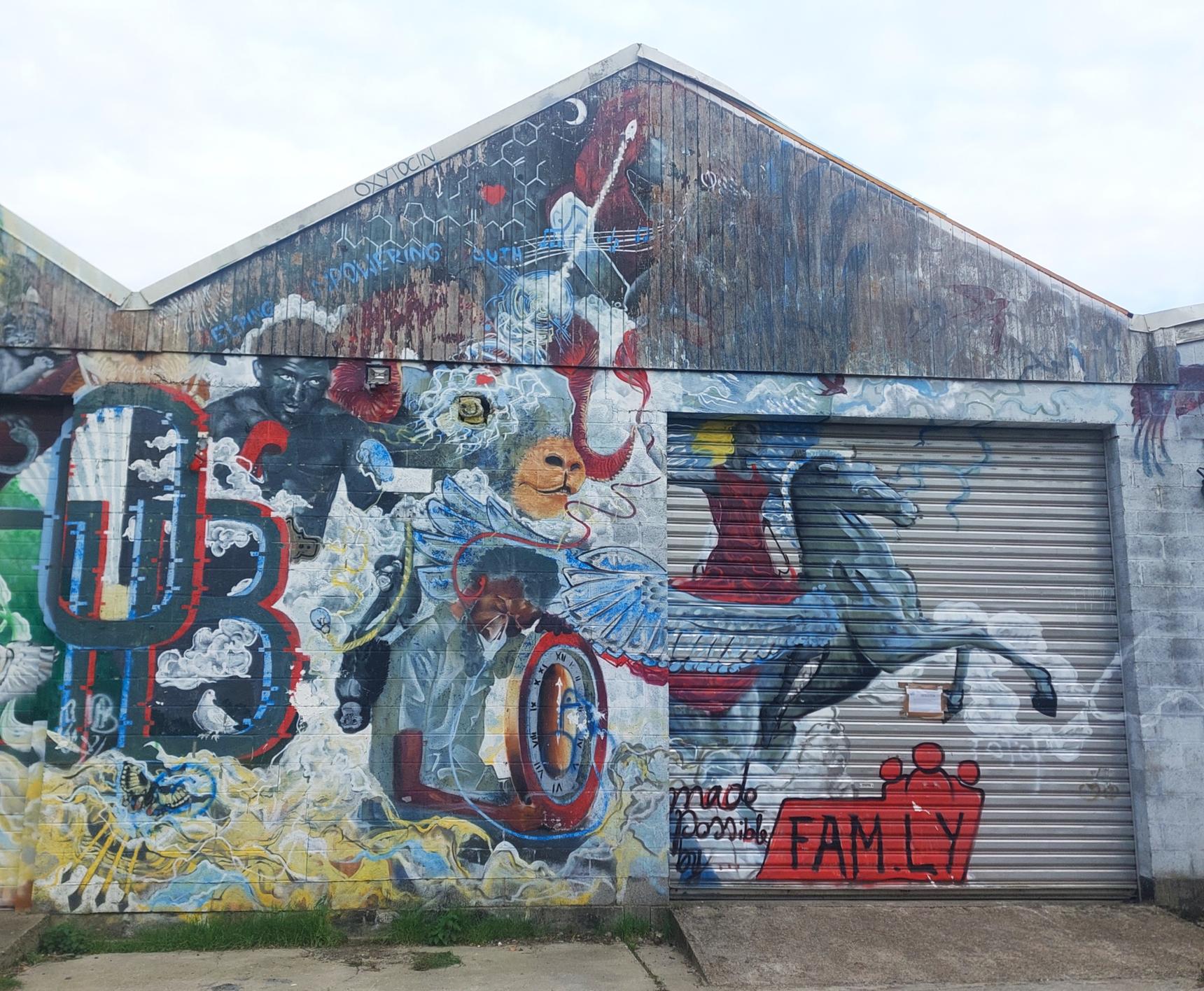 Het waren Zennelab, Riso en Fam.ly die de handen in elkaar sloegen en de kunstenaar uitnodigden om de loods in de tuin te versieren. Wat er op het gebouw kwam te staan, werd mee beslist door de jongeren van de wijk. Uit de brainstorm kwamen vooral natuur, muziek, sport en cultuur naar voren.