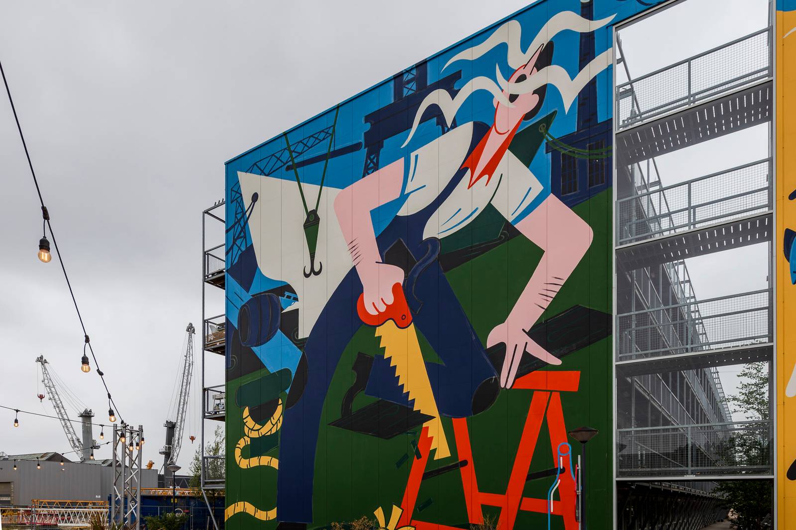 This mural tells the story of the Unilver site that used to be in this location. It's a triptych that show the history of the soap factory, refers to the port and fishing and gives a look into the future of the area.
