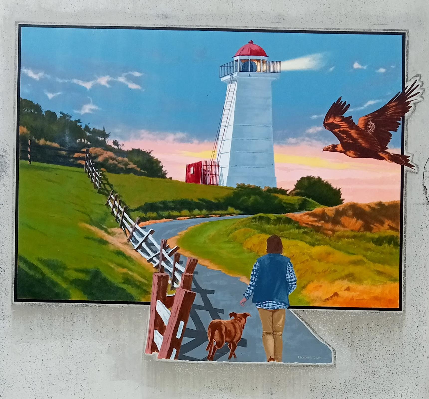 a woman, dog and bird entering a framed image of a cliff lighthouse in the distance