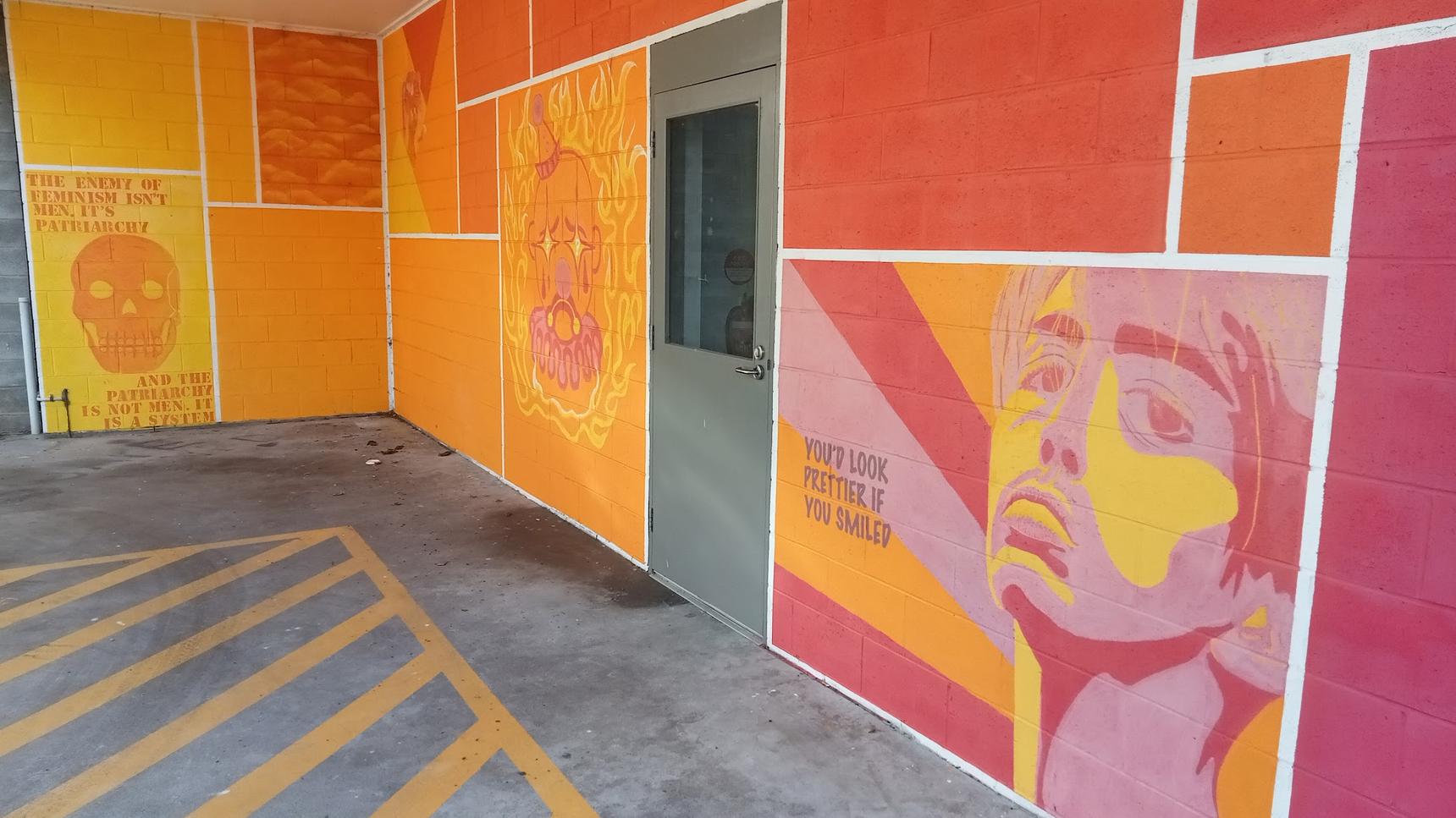 brightly coloured, positive feminist statements, in alcove near end of Timor Walk and Ozone Car Park