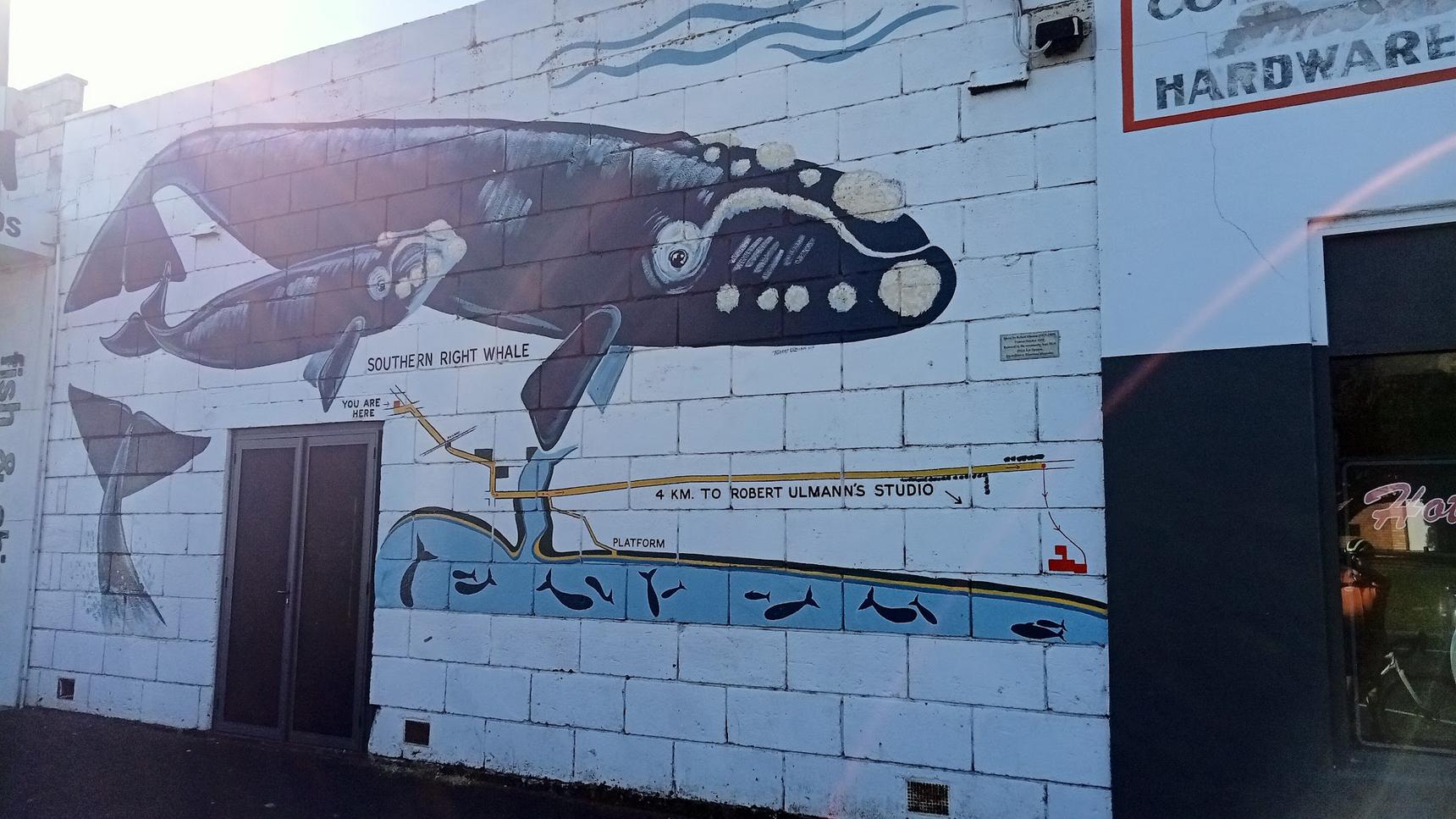 A Southern Right whale and calf on the southern wall on the corner of Flaxman and Nicholson Streets. It includes a map to the artist's former studio in Allansford. The mural was restored by Liz Gannon in 2014.
