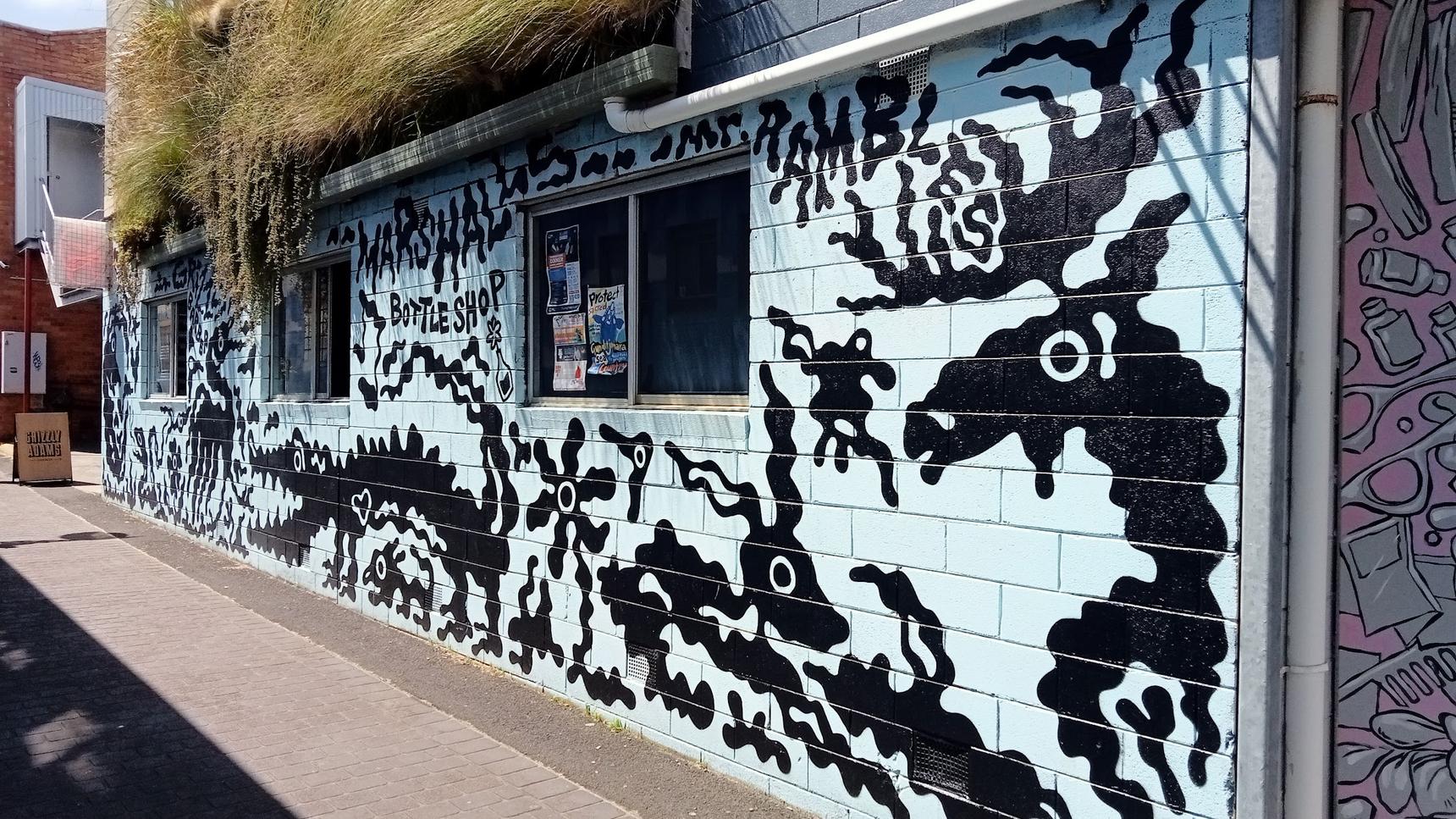 a long mural of 'squiggly' creatures in Ozone Lane