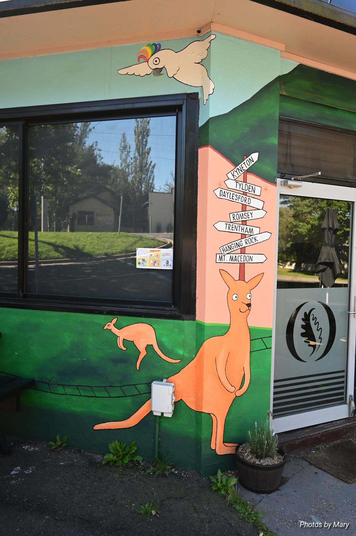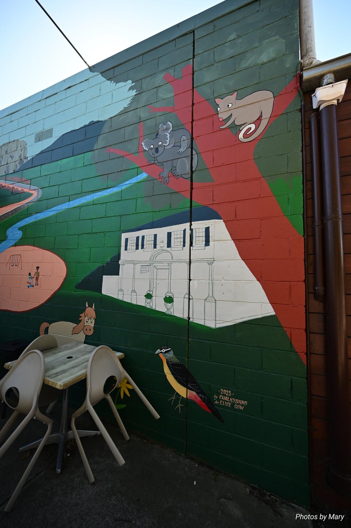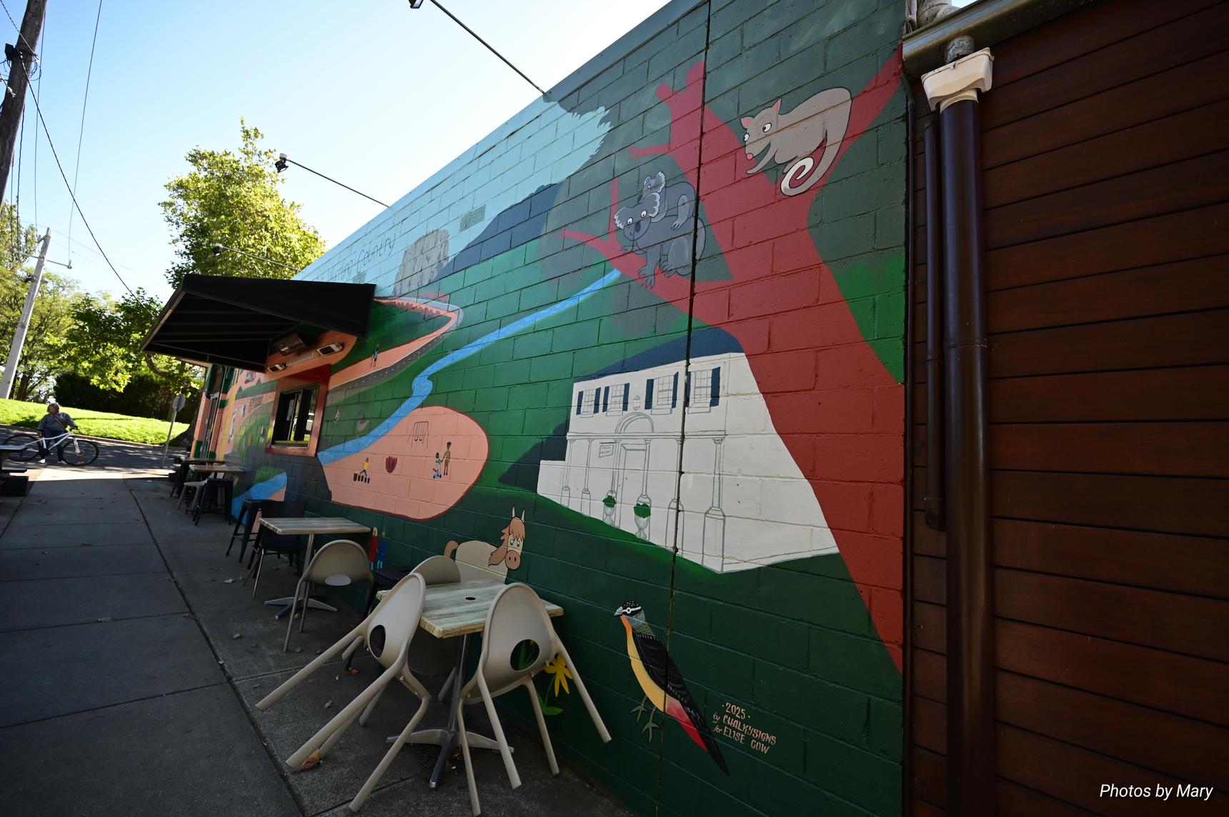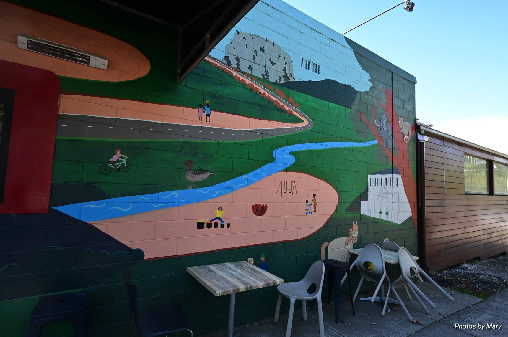 The mural is located on the side of the Oak and Stone cafe, and features various cartoon style animals and buildings