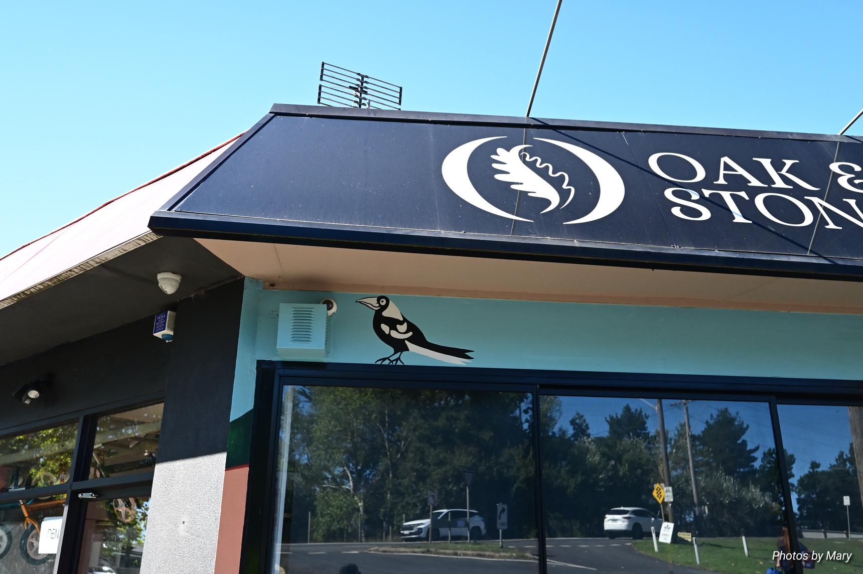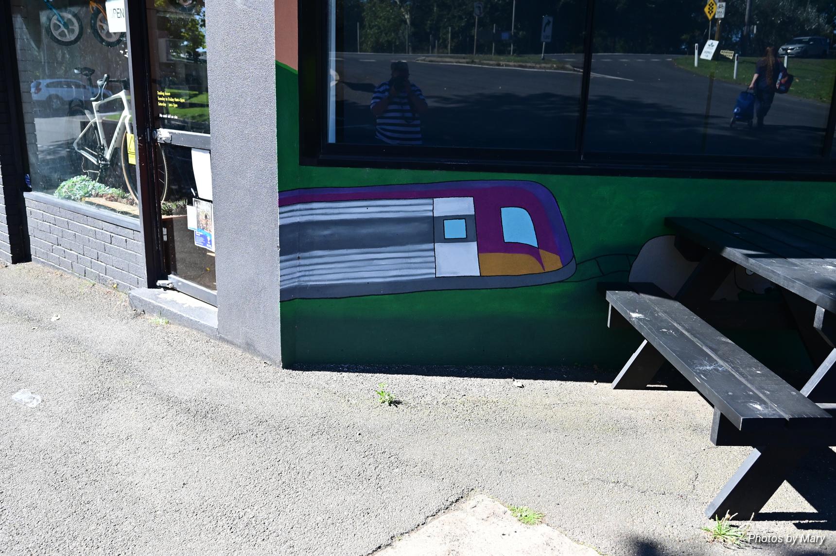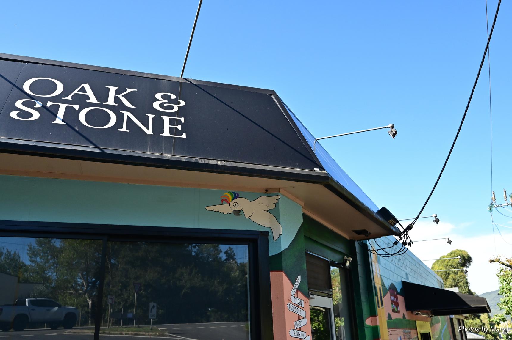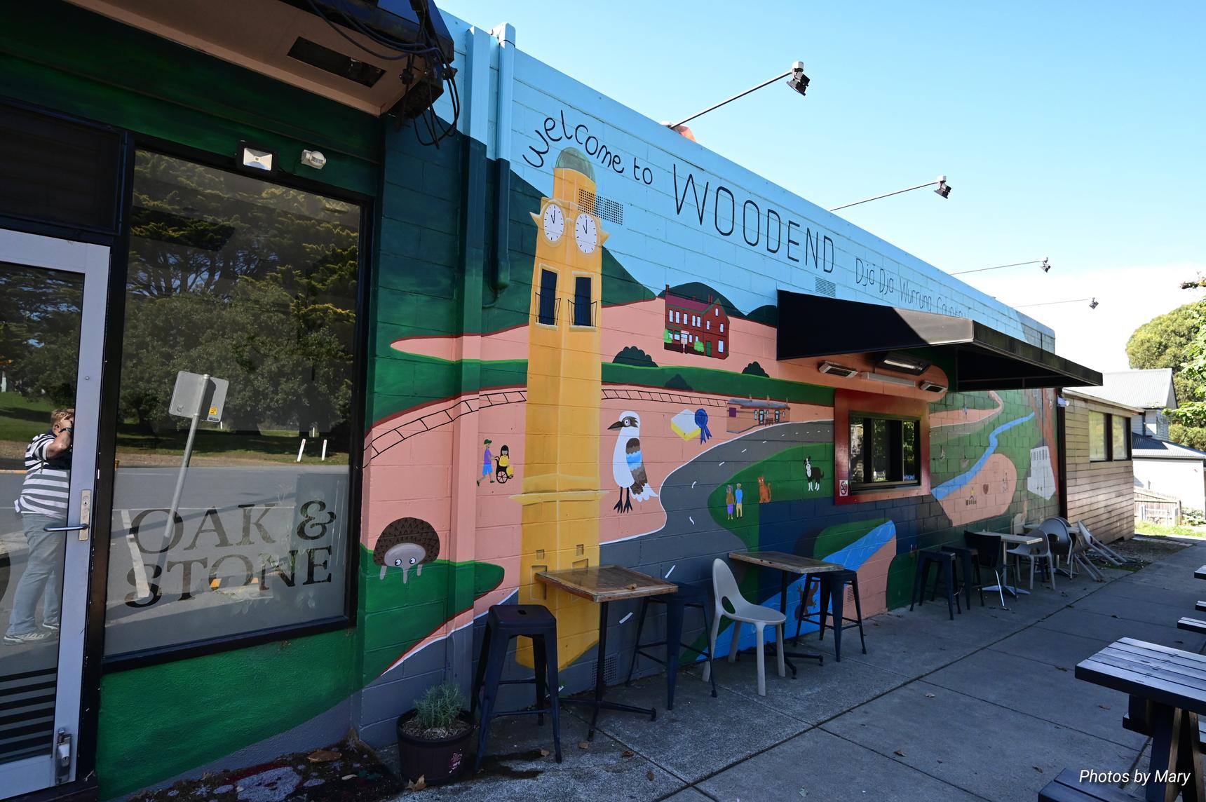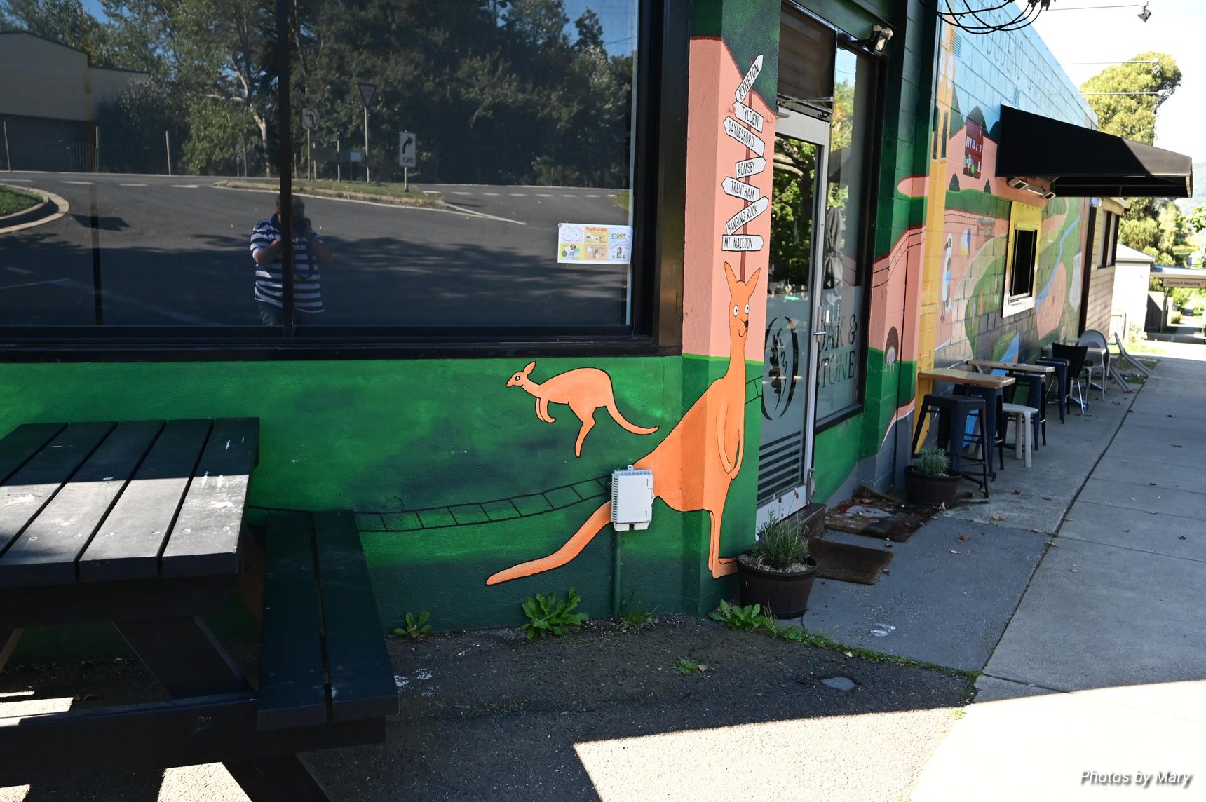 The mural is located on the side of the Oak and Stone cafe, and features various cartoon style animals and buildings