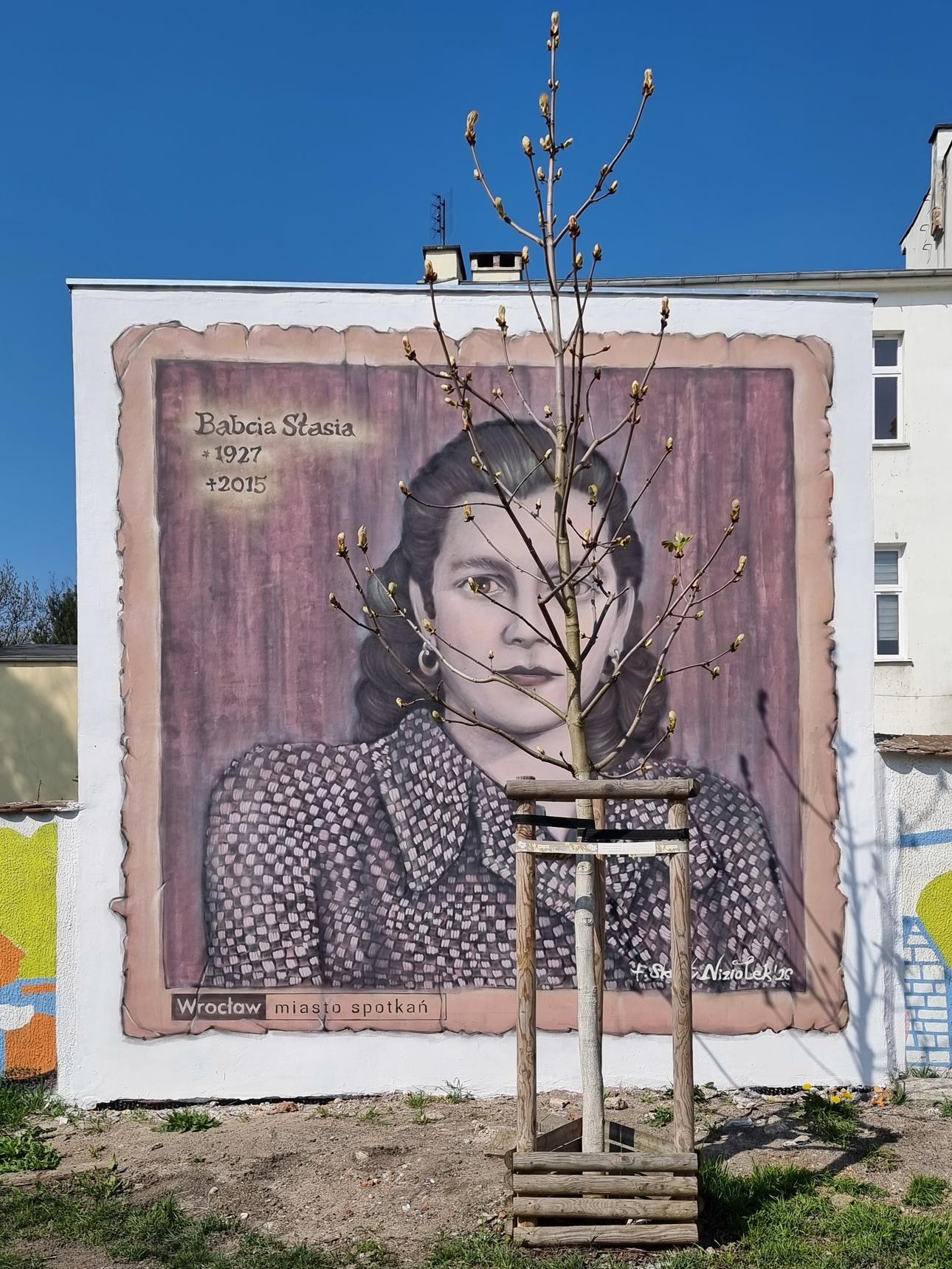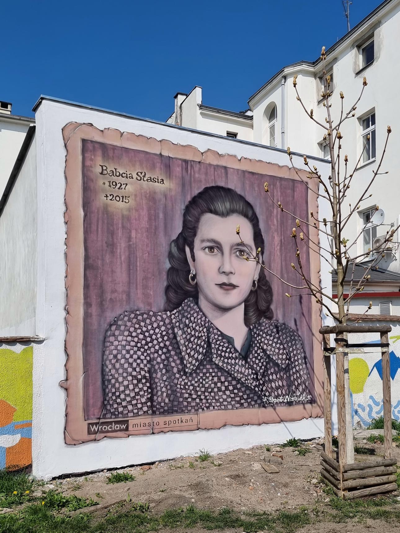 Stanisława Niziołek, née Pająk, was the grandmother of the artist, Filip Skont Niziołek. She lived in an annexe across from the bus terminus. The mural is an expression of longing for her.